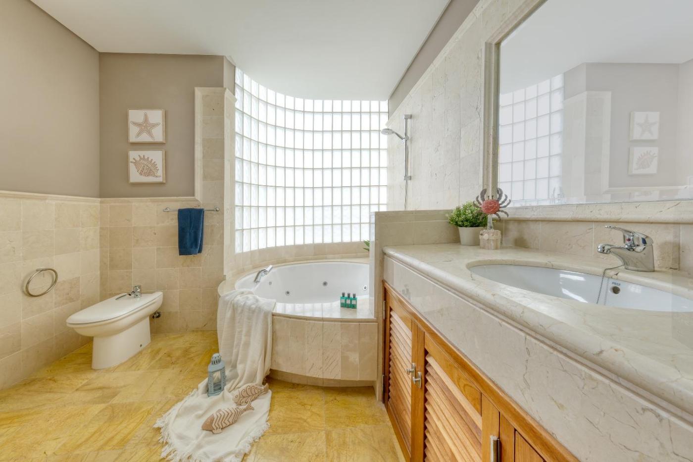 The villa with a terrace and sea views has 3 bedrooms, a living room, a flat-screen TV, an equipped kitchen with a dishwasher and an oven, and 3 bathrooms with a bidet. The air-conditioned unit at the property features a bath and a dressing room. The property has an outdoor dining area.
