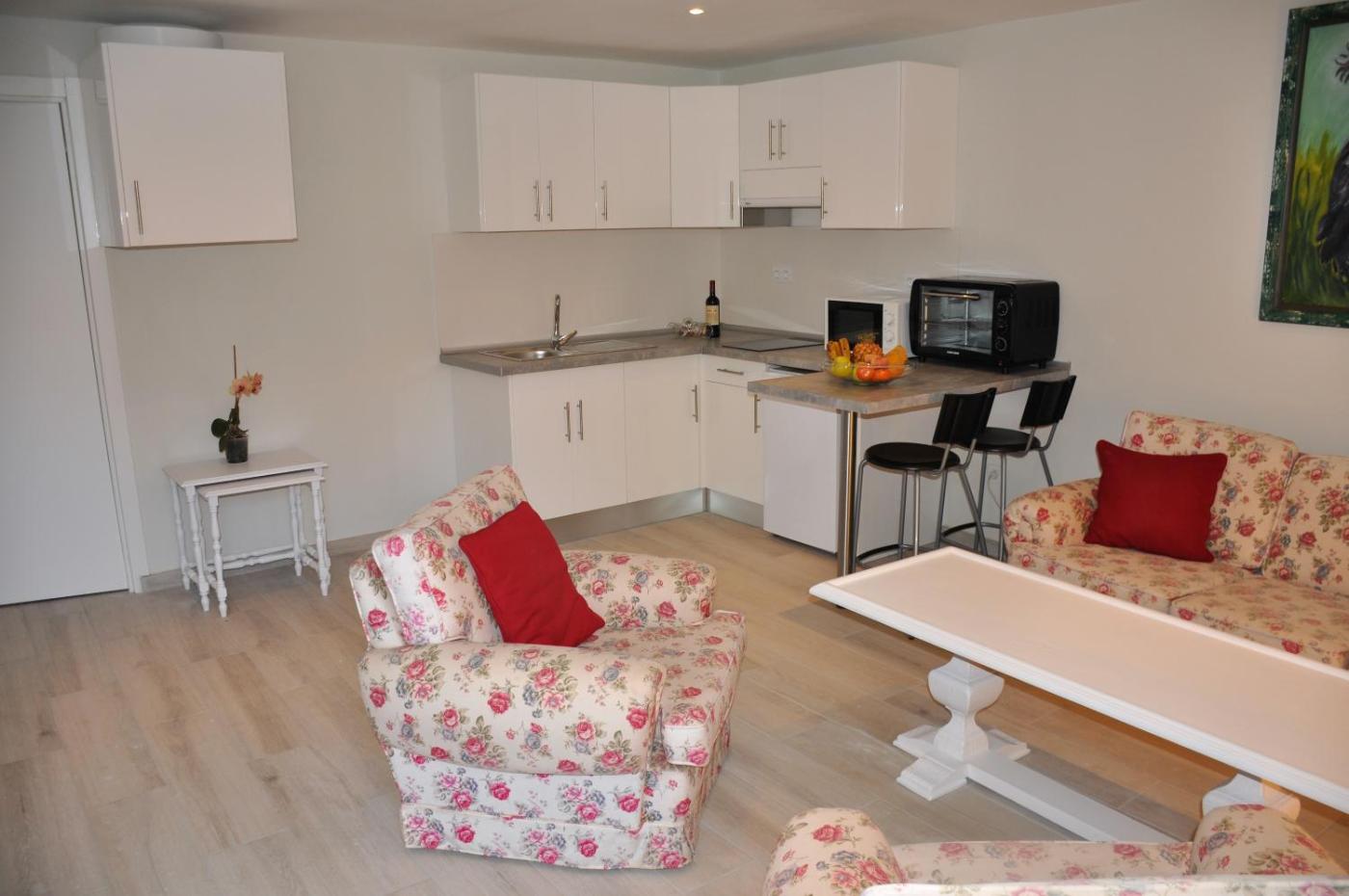 The spacious apartment has 2 bedrooms, 2 bathrooms, bed linen, towels, a flat-screen TV with streaming services, a dining area, a fully equipped kitchen, and a terrace with garden views. A private entrance leads gueststhe apartment,they can enjoy some fruits and chocolates or cookies. The property has an outdoor dining area.